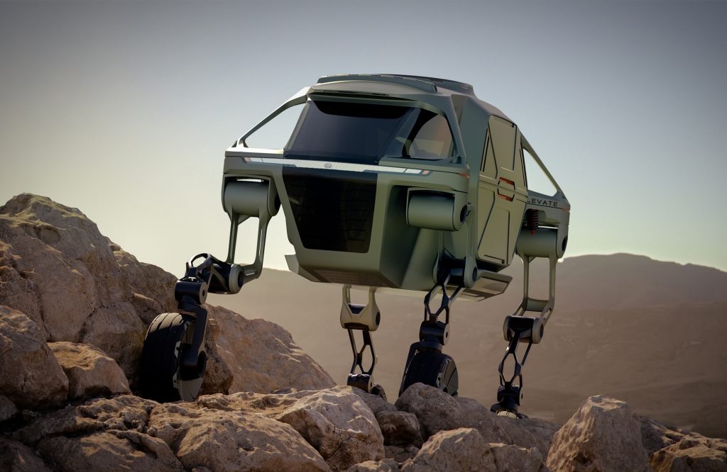 وتشمل المزايا الهندسية للمركبة النموذجية “إليفيت” ما يلي: أرجل روبوتية تتسم بمدى حرية حركة من خمس درجات، مع قوة دفع من داخل العجلة القدرةعلى المشي بأسلوب يحاكي الثدييات والزواحف لحركة شاملة في جميع الاتجاهات والقدرة على تسلق جدار عمودي بارتفاع متر ونصف القدرة على تجاوز فجوة بعرض متر ونصف والمحركات غير القابلة للدوران عكسياً تتيح للأرجل إمكانية قفل الحركة عند أية وضعية مطلوبة