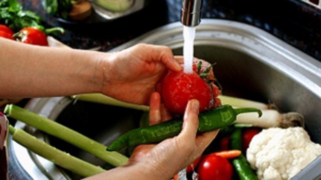تعقيم الخضار والفاكهة قبل استهلاكها لضرورة ماسّة من أجل تخفيف مخلّفات المبيدات الحشرية القابعة على سطحها. لعلّ أحسن وسيلة لتقليص نسبة الملوّثات الكيميائية الحاضرة على الخضار والفاكهة تكون بوضعها بنقيع الماء المضاف إليه بيكربونات الصوديوم أو صودا الخبز baking soda أو NaHCO3.