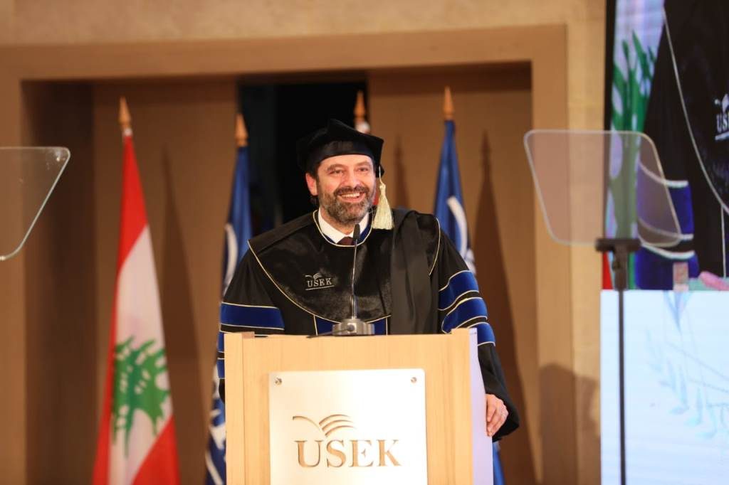 كلام الرئيس الحريري جاء خلال رعايته، مساء اليوم، حفل التخرج لكليات الهندسة والطب والموسيقى واللاهوت في جامعة الروح القدس -الكسليك، بقاعة البابا يوحنا بولس الثاني في حرم الجامعة، التي منحته درجة الدكتوراه الفخرية، بحضور حشد من الشخصيات الرسمية والاكاديمية. وفي ما يلي نص الكلمة: الآباتي نعمة الله الهاشم، الرئيس العام للرهبنة اللبنانية المارونية، حضرة رئيس الجامعة وأعضاء مجلس الأمناء، والهيئة التعليمية والإدارية، سعادة السفير البابوي،أصحاب المعالي والسعادة، حضرات الأهالي الكرام،أيها الطلاب المتخرجون، مناسبات الخير والتلاقي والوحدة، تصنع المواعيد الكبرى في تاريخ الأوطان. موعدي معكم اليوم مناسبة على طريق الخير، لأجل لبنان.