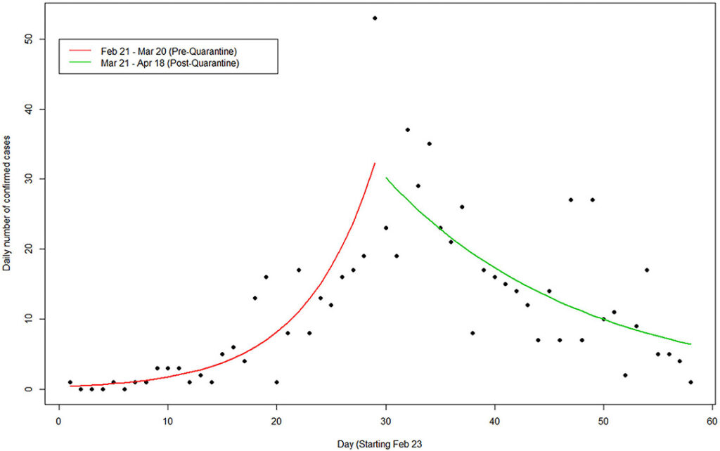 واستندت الدراسة الى تحليل بيانات الوقوع الفعلي real time incidence data للأصابات التي نشرتها وزارة الصحة وفقا لنظام بواسون الإحصائي الذي أعطى النتائج العلمية المستندة الى أرقام نمو الحالات وانخفاضها.