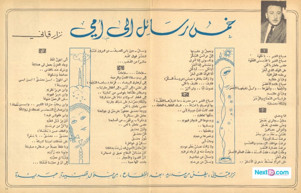 كتبت الكاتبة والأديبة غادة السمان في “القدس العربي” في 6 نوفمبر تشرين الثاني من عام 2020 عن نشرها لقصيدة الشاعر الكبير نزار قباني “خمس رسائل إلى أمي” التي كتبها في عام 1965 عندما كان سفيراً لسوريا في إسبانيا في عام 1962 ولمدة 4 سنوات ، في مجلة “الأسبوع العربي” في الأول من آذار من ذلك العام ، ولحسن الحظ حصل nextlb على ذلك العدد من مجلة “الأسبوع العربي” الذي نشرت فيه القصيدة ، ونعيد نشرها بصورتها الأصلية وبمقاطعها الخمسة مع الشكر للكاتبة غادة السمان التي ذكرت هذه الوقائع التي صارت جزءاً من التاريخ منذ أكثر من خمسة عقود .