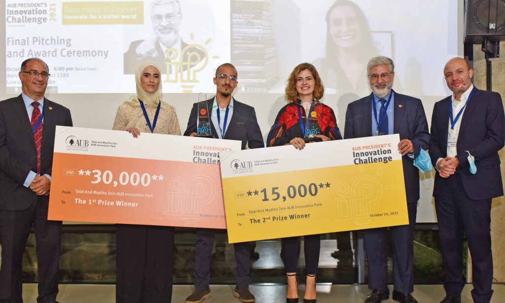 فازت شركتان ناشئتان بجائزة تحدّي رئيس الجامعة الأميركية في بيروت للإبتكار” من بين 10 مشاركين يحملون ابتكارات وأفكاراً لشركات ناشئة في حفل العرض النهائي وإعلان الجوائز ، وقد اختارت لجنة الحكم، المؤلفة من قادة متخصصين ، فكرتين لشركتين ناشئتين للحصول على جوائز نقدية قدرها 45 ألف دولار أميركي، بالإضافة إلى احتضان كامل و دعم إرشادي في واحة طلال ومديحة الزين للإبتكار ضمن الجامعة الأميركية في بيروت(AUB) .