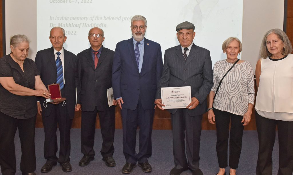 بعد ذلك قدّم رئيس الجامعة الدكتور فضلو خوري ميدالية الجامعة لعائلة حدادين ممثلة بالدكتور منذر حدادين، شقيق الراحل.