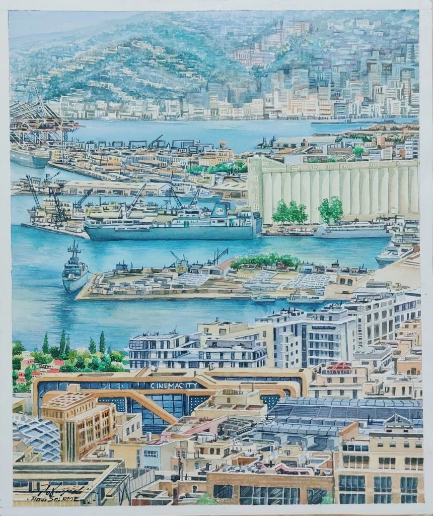 سلامة أراد للوحته المائية الجديدة التي اختار لها الشكل الطولي اسم “سطوح ومرفا بيروت” أن تجمع ما بين منازل بيروت وأحيائها مع مرفئها التاريخي وأهراءاتها في وضعها الطبيعي قبل الإنفجار المدمر الذي قضى أو يكاد على ذاكرة جيل بالكامل .
