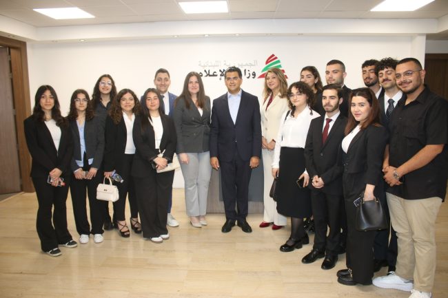 وكان الوفد الطالبي، جال في مديريات وزارة الإعلام، واستقبله المدير العام للوزارة الدكتور حسان فلحه الذي أكد “أهمية الجهد الشخصي الذي يجب أن يقوم به الطلاب من أجل تكوين شخصية ثقافية”، مشدداً على “ضرورة الصدق وتهذيب النفس”.