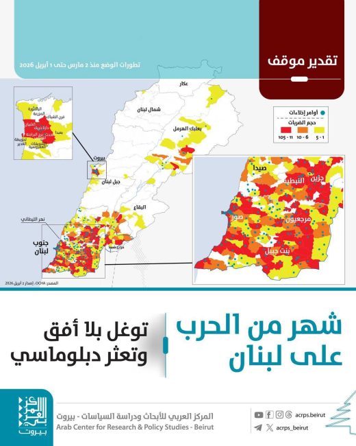 في تقدير موقف جديد صادر عن المركز العربي للأبحاث ودراسة السياسات – بيروت، عُرضت قراءة شاملة لمسار الحرب الإسرائيلية على لبنان مع دخولها شهرها الثاني، في ظل غياب أي مسار سياسي أو دبلوماسي فعّال، مقابل تصاعد دور الميدان في توجيه مسار المواجهة.