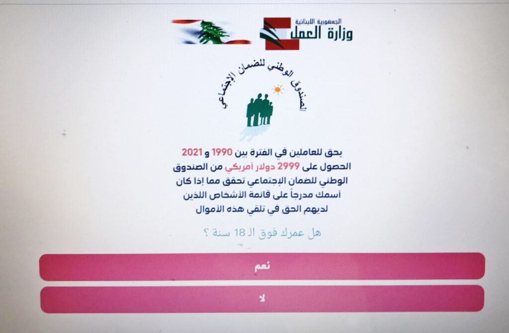 “عطفا على البيانات الصادرة سابقاً في هذا الخصوص، وحيث ما زال يتداول عبر مواقع التواصل الإجتماعي خبر منسوب إلى وزارة العمل مفاده أنه يحق للعاملين في الفترة ما بين عامي 1990 و2021 الحصول على 2999 دولاراً أميركياً من الصندوق الوطني للضمان الإجتماعي ويدعو المواطنين للتحقق مما إذا كان إسمهم مدرجاً في قائمة الأشخاص الذين لديهم الحق في تلقي هذه الأموال عبر الرابط المرفق بالخبر،