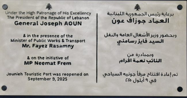 يشار إلى أنه “أعيد افتتاح مرفأ جونية السياحي بعد ثلاثة عقود من الغياب والإقفال، بجهود جماعية، ليشكل محطة رمزية وعملية في آن واحد. ويتوقع أن يحقق المشروع فوائد سياحية كبيرة وأن يكون رافعة اقتصادية للبنان، كما يشكل دلالة واضحة على أن الإنتاجية والإنماء يتحققان بأبهى صورة في ظل تعاون مثمر وبناء بين القطاعين العام والخاص”.