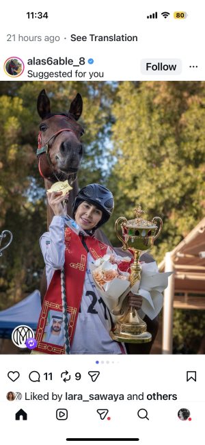 وأشادت البطلة بجوادها وقالت انه أظهر قدرات عالية خلال السباق، كما أشادت بالمدرب وفريق العمل في الإسطبل على جهودهم الكبيرة ودعمهم المستمر، الذي أثمر هذا الفوز الكبير.