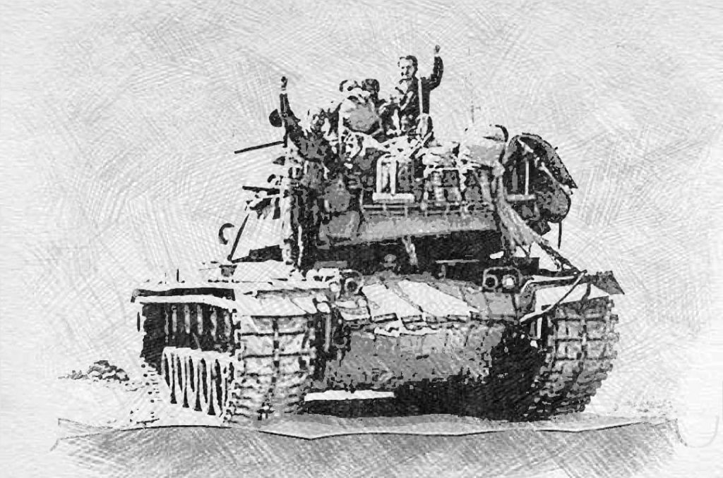 وفي وقت سابق لهذه المناظر الرهيبة ، تمر في المكان دبابة ضخمة يعتلي ظهرها مجموعة من المقاومين بسرعة البرق ، وترتج الطريق المحفرة بالقذائف تحت ثقل جنازيرها … إنها دبابة إم 48 إسرائيلية من أصل بضعة دبابات قد غنمها المقاومون وتتجه شمالاً ويرفع من عليها شارات النصر ، عُرف فيما بعد أن من كان يقودها هو العقيد الفلسطيني في الجيش السوري صلاح معاني الذي قادها الى دمشق حسب رواية أحد المشاركين في العملية زياد الحمصي ، الذي سيبرز إسمه في سنوات لاحقة في ملف شائك ، إنطلاقاً من وجوده في ساحة المعركة في تلك الساعات العصيبة .