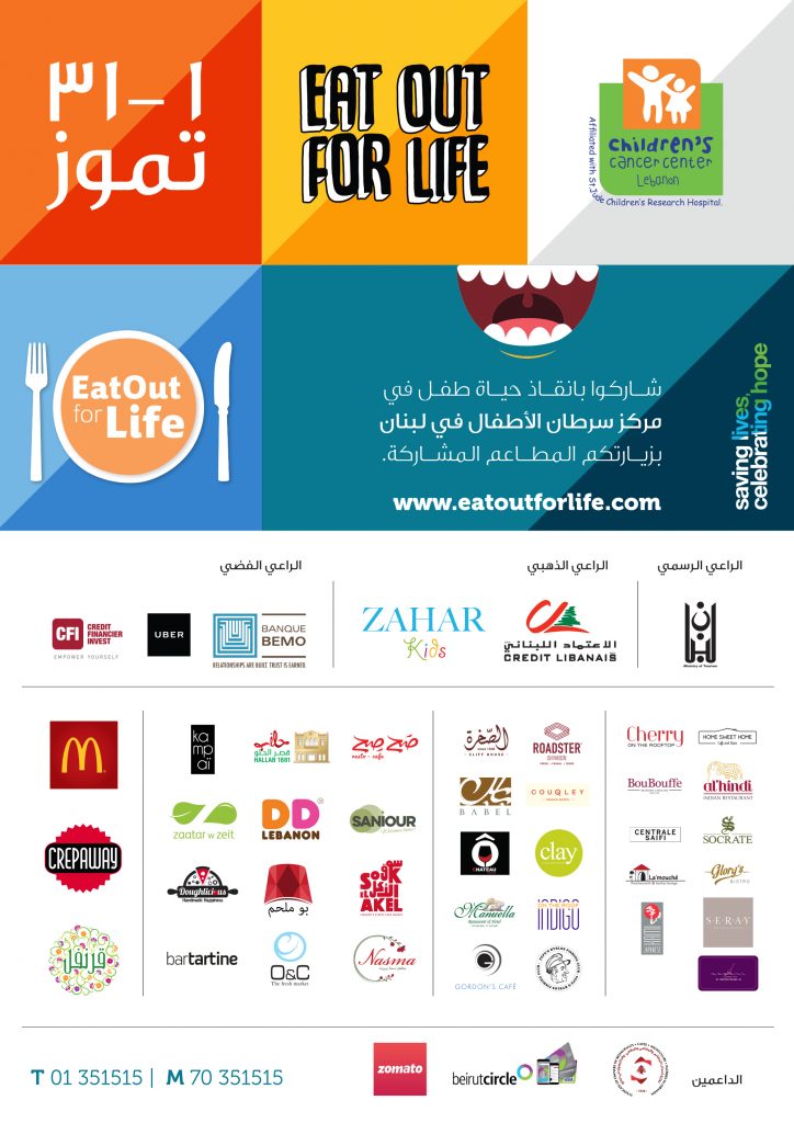أطلق مركز سرطان الأطفال في لبنان (CCCL) تحت رعاية وزارة السياحة يوم الاحد 1 تموز حملته السنوية Eat Out for Life وهي مبادرة تستمر من 1 الى 31 تموز يمكن من خلالها المساهمة في علاج أربعة أطفال مرضى في المركز من خلال تناول وجبة في واحد من عشرات المطاعم المشاركة، إذ أن نسبة من كل فاتورة يدفعها رواد هذه المطاعم خلال الفترة المشار إليها تعود إلى المركز.