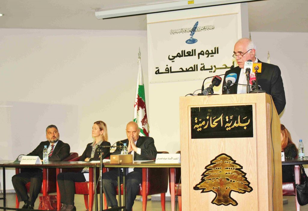 أحيت نقابة محرري الصحافة اللبنانية “اليوم العالمي لحرية الصحافة” في مبنى بلدية الحازمية برعاية وزير الإعلام جمال الجراح ممثلا بالمدير العام للوزارة الدكتور حسان فلحة، وحضور ممثلة وزير الخارجية والمغتربين جبران باسيل مستشارته الين فرح، ممثل النائب سامي الجميل جورج شاهين، الوزير السابق زياد بارود، النائب السابق ناصر قنديل، نقيب المحررين جوزف القصيفي، ممثل نقيب الصحافة عوني الكعكي ، رئيس تحرير جريدة “الشرق” خليل الخوري، رئيس بلدية الحازمية جان الأسمر، نقيب المصورين الصحافيين عزيز طاهر، مدير مكتب الأونيسكو الإقليمي في بيروت الدكتور محمد بن سيف الهمامي ممثلاً بمسؤول البرامج والإتصال جورج عواد وممثلين عن القوى الأمنية وحشد من الإعلاميين.