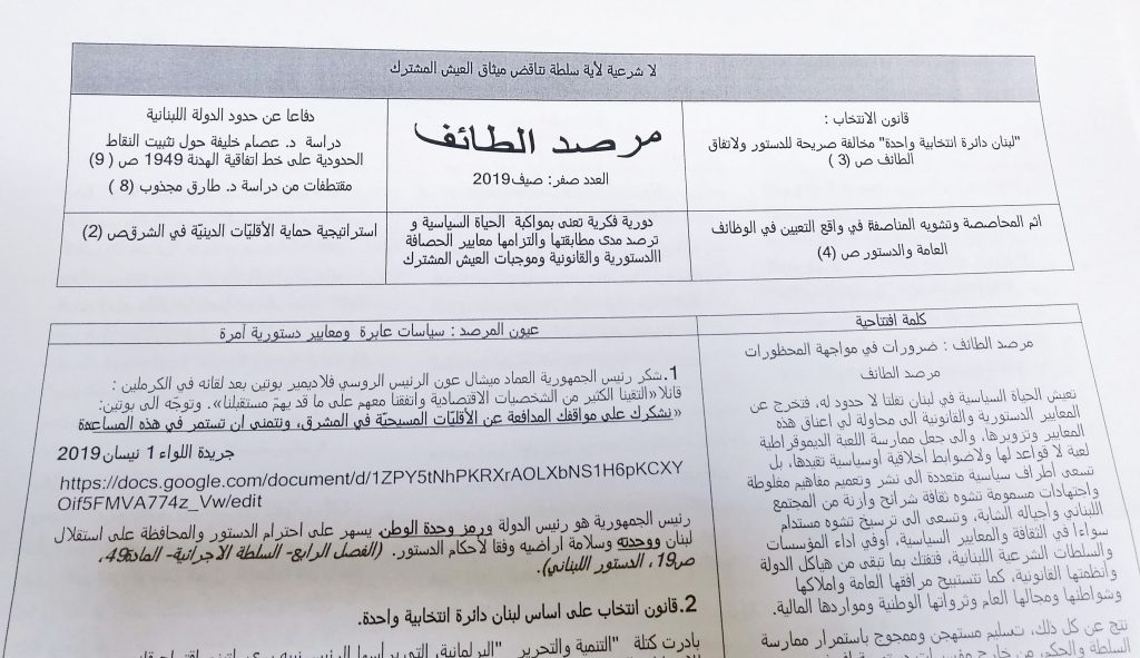 وصدر العدد الصفر من النشرة بعنوان “مرصد الطائف” وخصص اجتماع الشخصيات الـ30 أول من أمس للإطلاع على النشرة ومتابعة النقاش على أن يصدر العدد الأول من النشرة قريباً.