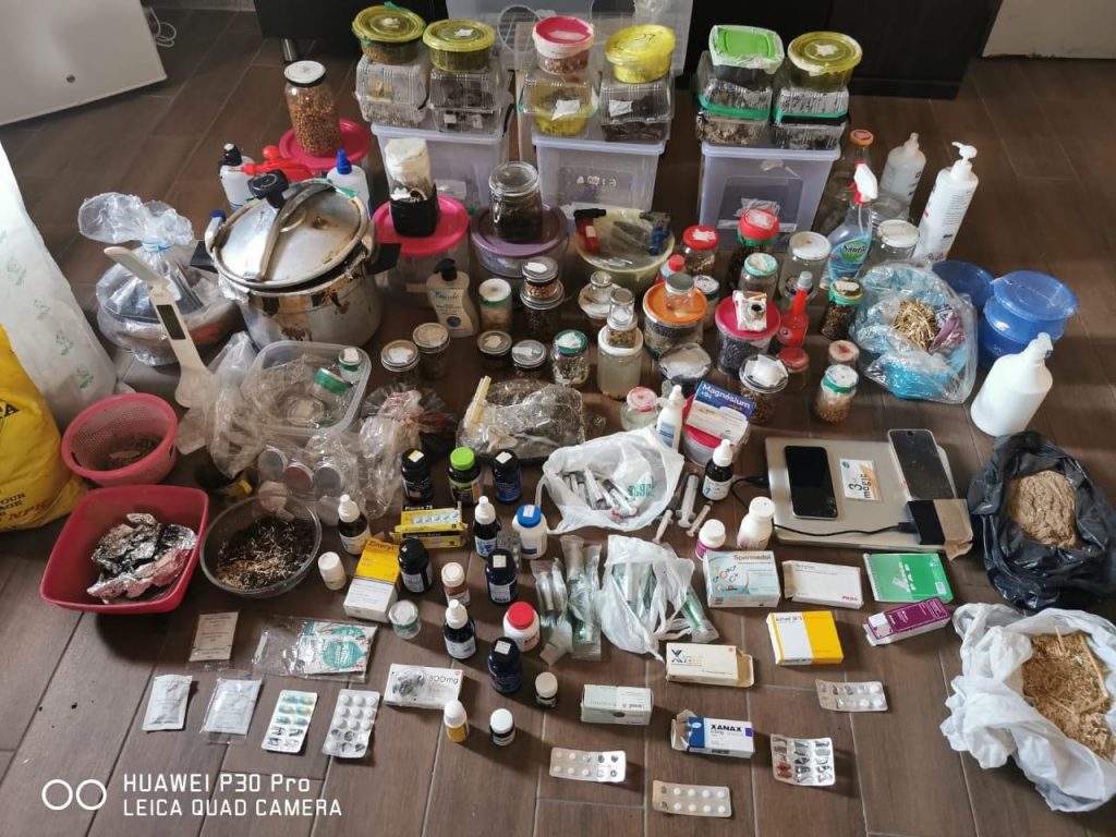 بتفتيش الشقة -وهي قيد الإنشاء- تبيّن وجود مزرعة ومختبر لتلقيح وتجهيز بذور “الفطر السحري”، بحيث تم ضبط كمية منه ومن حشيشة الكيف.