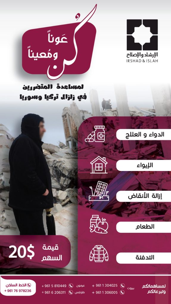 تلبيةً للواجب الإنساني والديني، ودعماً لإخواننا المنكوبين جرّاء الزلزال المدمِّر الذي وقع في تركيا وسوريا، أطلقت جمعية الإرشاد والاصلاح الحملة الإغاثية العاجلة: “كُن عوناً ومعيناً”. ومصداقاً لحديث الرسول الكريم “والله في عون العبد ما كان العبد في عون أخيه”، تسعى الجمعية إلى إغاثة المتضررين والتخفيف من معاناتهم وذلك من خلال تأمين الاحتياجات الرئيسية التي تتضمن تأمين الدواء والعلاج، تأمين الإيواء للمشردين، المساعدة في إزالة الأنقاض، تأمين الطعام الجاهز والمواد الغذائية، وتأمين وسائل التدفئة.