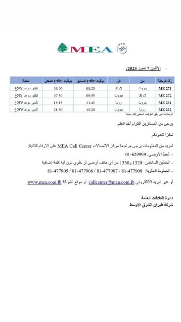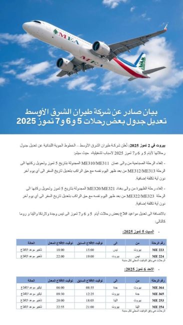 أعلنت Middle East Airlines – Air Liban شركـة طيران الشرق الأوسط – الخطوط الجوية اللبنانية في بيان “تعديل جدول رحلاتها لأيام 5 و6 و7 تموز 2025 لاسباب تشغيلية .