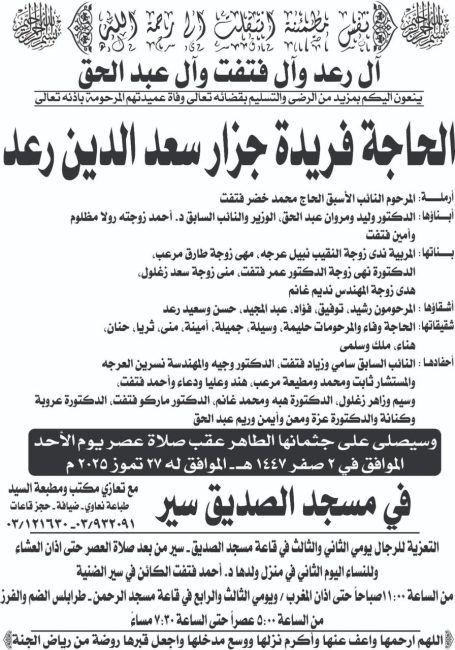 توفيت صباح اليوم الأحد شمال لبنان، والدة الوزير والنائب اللبناني السابق أحمد فتفت ، ونعى آل رعد وآل فتفت وآل عبد الحق، ببالغ الحزن والأسى، فقيدتهم الحاجة فريدة جزّار سعد الدين رعد، أرملة المرحوم النائب السابق الحاج محمد خضر فتفت، ووالدة الوزير والنائب السابق الدكتور أحمد فتفت.