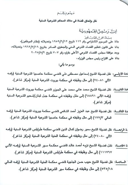 الجدير بالذكر أن مجلس القضاء الشرعي الأعلى، برئاسة سماحة المفتي، يُعنى بتعيين ونقل القضاة في المحاكم الشرعية السنية في لبنان.