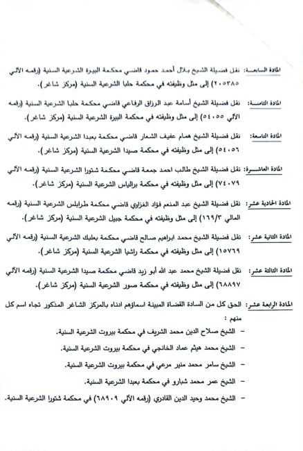كما اصدر المجلس سلسلة من التعيينات والتشكيلات طالت مجموعة من القضاة الشرعيين حصل nextlb على نسخة منها