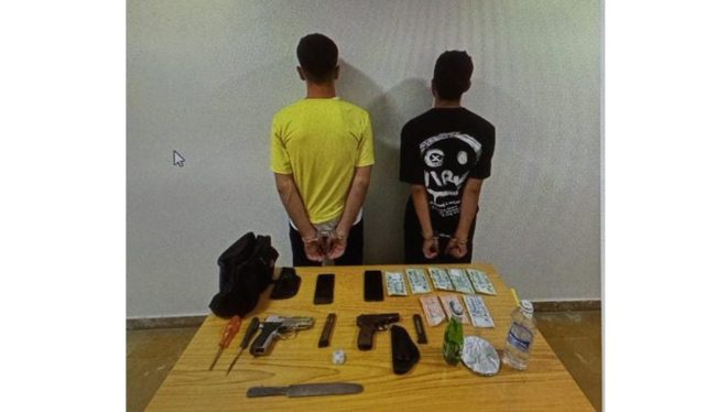 بتفتيشهما والدرّاجة، تمّ ضبط مسدّسَين حربيَّين مع ممشطَين و/8/ طلقات صالحة للاستعمال، علبة بلاستيكية بداخلها مادّة الباز، مسنّ حديدي يستخدمه بأعمال سرقة الدرّاجات، أدوات تُستَخدَم لتعاطي المخدّرات، هاتفَين خلويَّين ومبلغ مالي.