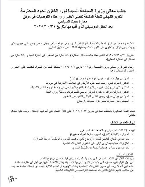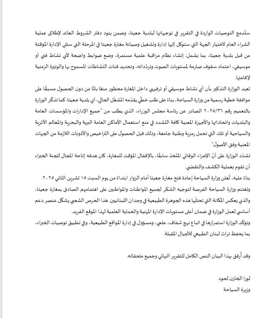 أصدرت وزارة السياحة بياناً حول التقرير النهائي للجنة تقصي الأضرار في مغارة جعيتا، بعد أن أقيم حفل زفاف في داخلها.