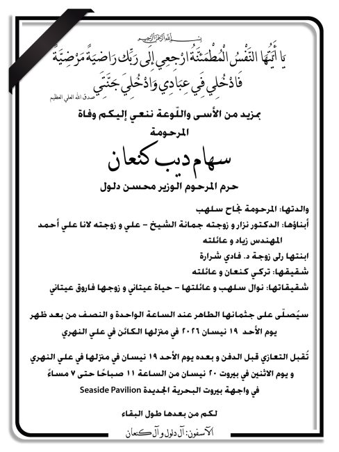 وسيُصلّى على جثمانها الطاهر اليوم الأحد 19 نيسان 2026 عند الساعة الواحدة والنصف بعد الظهر، في منزلها الكائن في عاليه – النهري، على أن تُقبل التعازي قبل الدفن وبعده في منزلها، ويوم الاثنين في بيروت – واجهة بيروت البحرية (Seaside Pavilion) من الساعة 11 صباحاً حتى 7 مساءً.