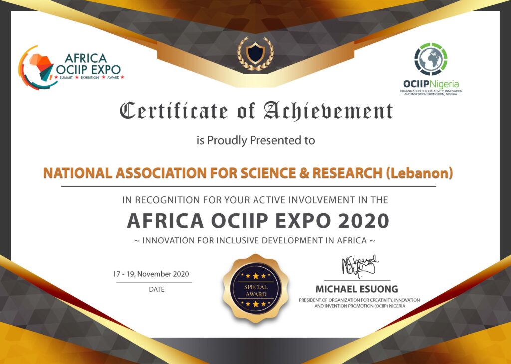 حصد اختراعان لبنانيّيان ميداليتين ذهبتين في معرض أفريقيا للإختراعات التّي نظمّته الجمعية الأفريقية لتنمية الابتكار والاختراع والإبداع (Africa OCIIP) والذي جرى بصيغة أونلاين عن بعد عبر منصة تفاعلية بين 17 و19 تشرين الثاني نوفمبر 2020 ، وأتى الفوز نتيجة مشاركة الهيئة الوطنية للعلوم والبحوث في المعرض، ضمن استراتيجية الهيئة لدعم المبتكرين وتسويق اختراعاتهم عالمياً.