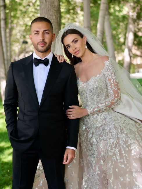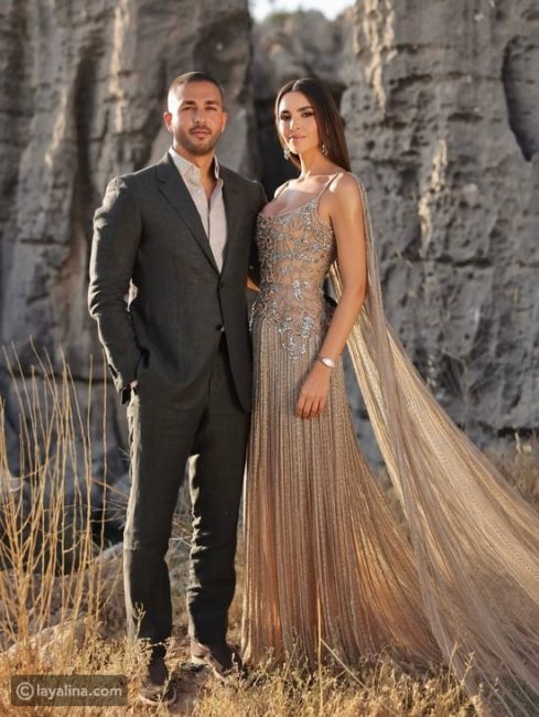 أطلت العروس بفستان سهرة أنيق يحمل توقيع إيلي صعب، بلون ذهبي خافت وتفاصيل دقيقة أبرزت أنوثتها، فيما اختار العريس إطلالة رسمية أنيقة تليق بالمناسبة.